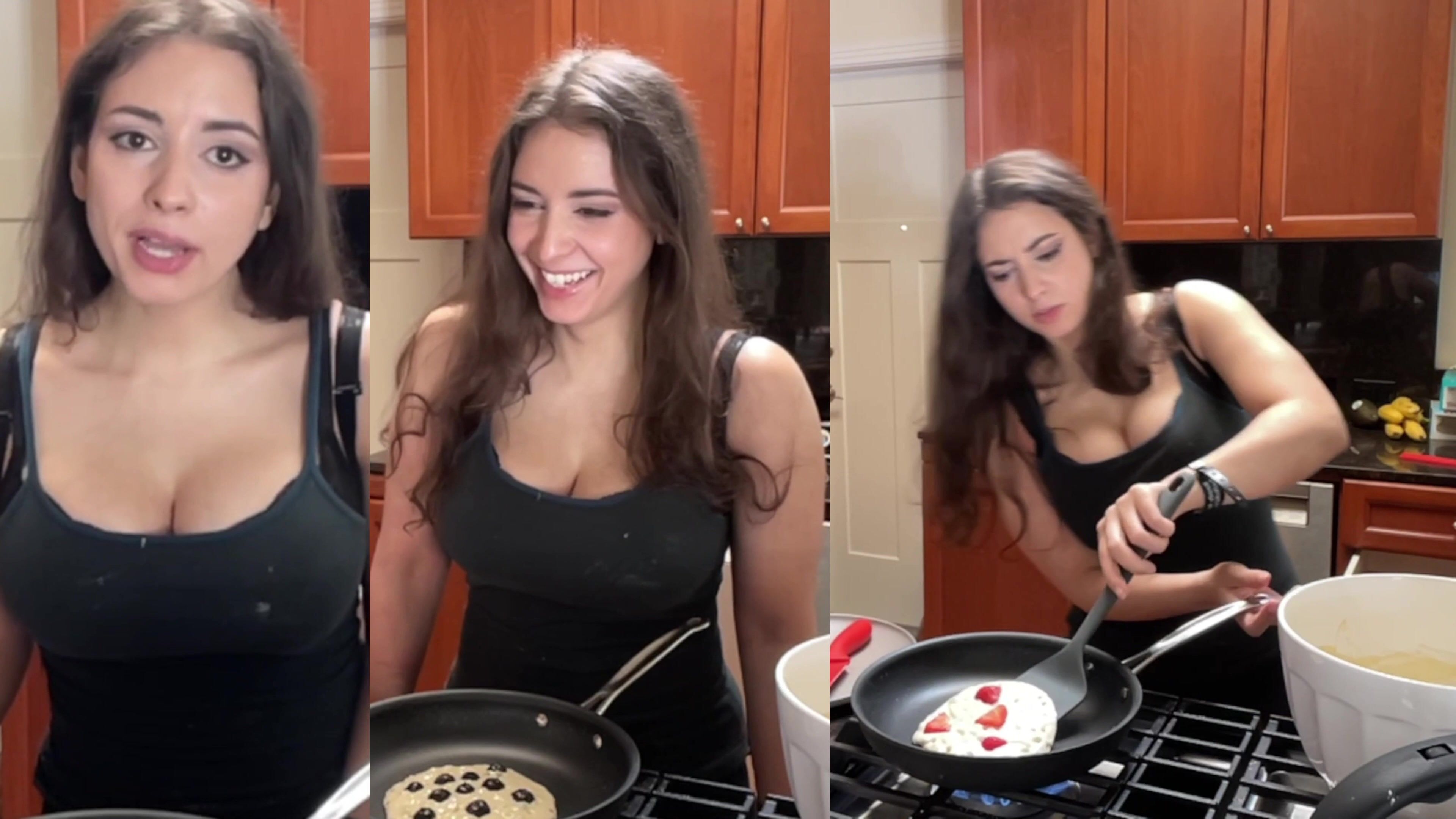 Sweet Anita heats things up in the kitchen wearing a revealing black outfit as she cooks pancakes and flirts with viewers in this fun and flirty video.