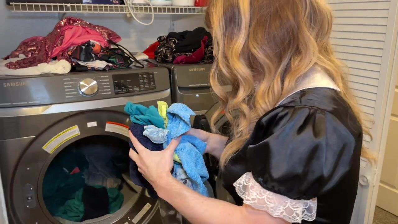 Sissy Maid Servitude And Punishment In Chastity video features a submissive sissy maid in a black maid outfit performing chores and obedience tasks under the command of a dominant mistress in a blue dress and heels