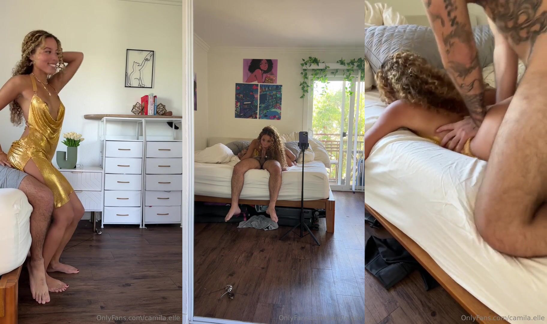 Camila Elle teases in a shimmering gold dress before getting down and dirty in her leaked sex tape video, showcasing every sweaty, steamy moment you won't want to miss, including some intense pussy pounding and epic moans.